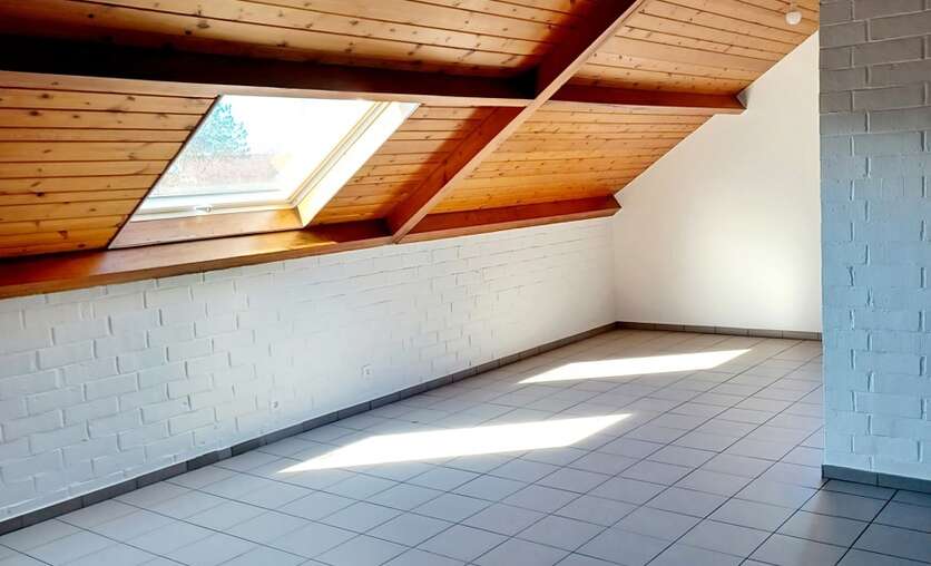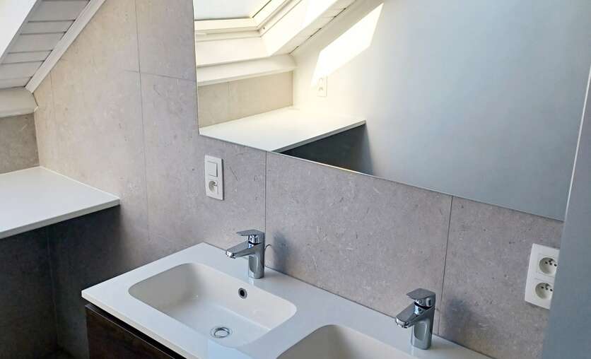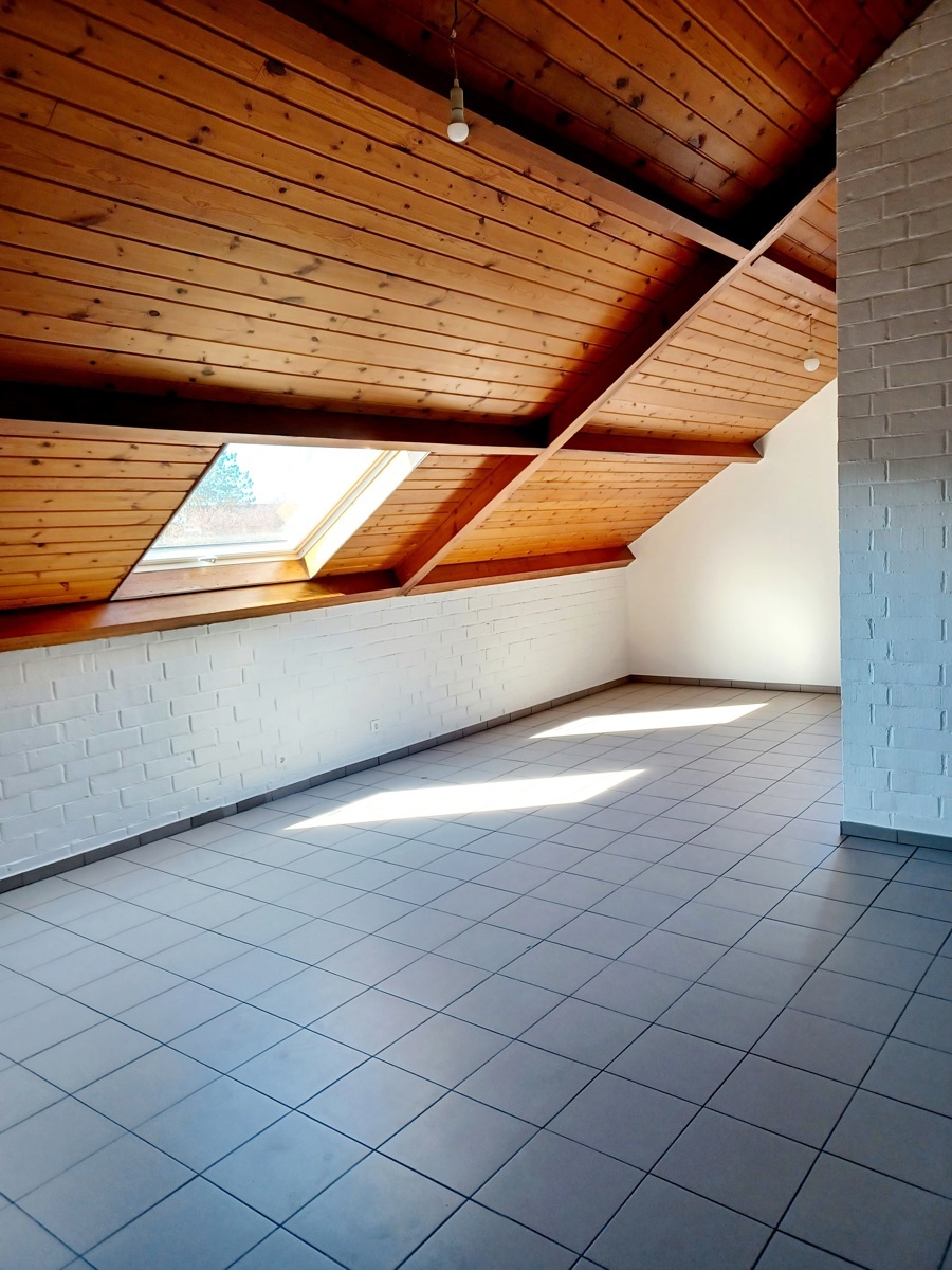 Indeling: inkomhal, wc, nieuw ingerichte keuken (koelkast-vaatwas-gootsteen-kookplaat-dampkap-combi-oven en meubilair), ruime living (38 m²), 2 slaapkamers (2 x 13 m²) met mansarderuimte voor extra stockage, nieuwe badkamer/wasplaats met regendouche, dubbel lavobomeubel met spiegel, aansluiting voor wasmachine en droogkast. Boven het appartement bevindt er zich nog een bergzolder (12 m²) voor privatief gebruik. Op het gelijkvloers vinden we de garage met berging. Er wordt verwarmd via nieuw geplaatste warmtepompen in de leefruimte en slaapkamers. EPC-label 'B'. Het appartement is reeds geschilderd en dus instapklaar! Maandelijkse lasten 25 € (poetsen gemeenschappelijke delen,...). Contacteer ons voor meer info en/of bezoek via email: info@denderimmo.be